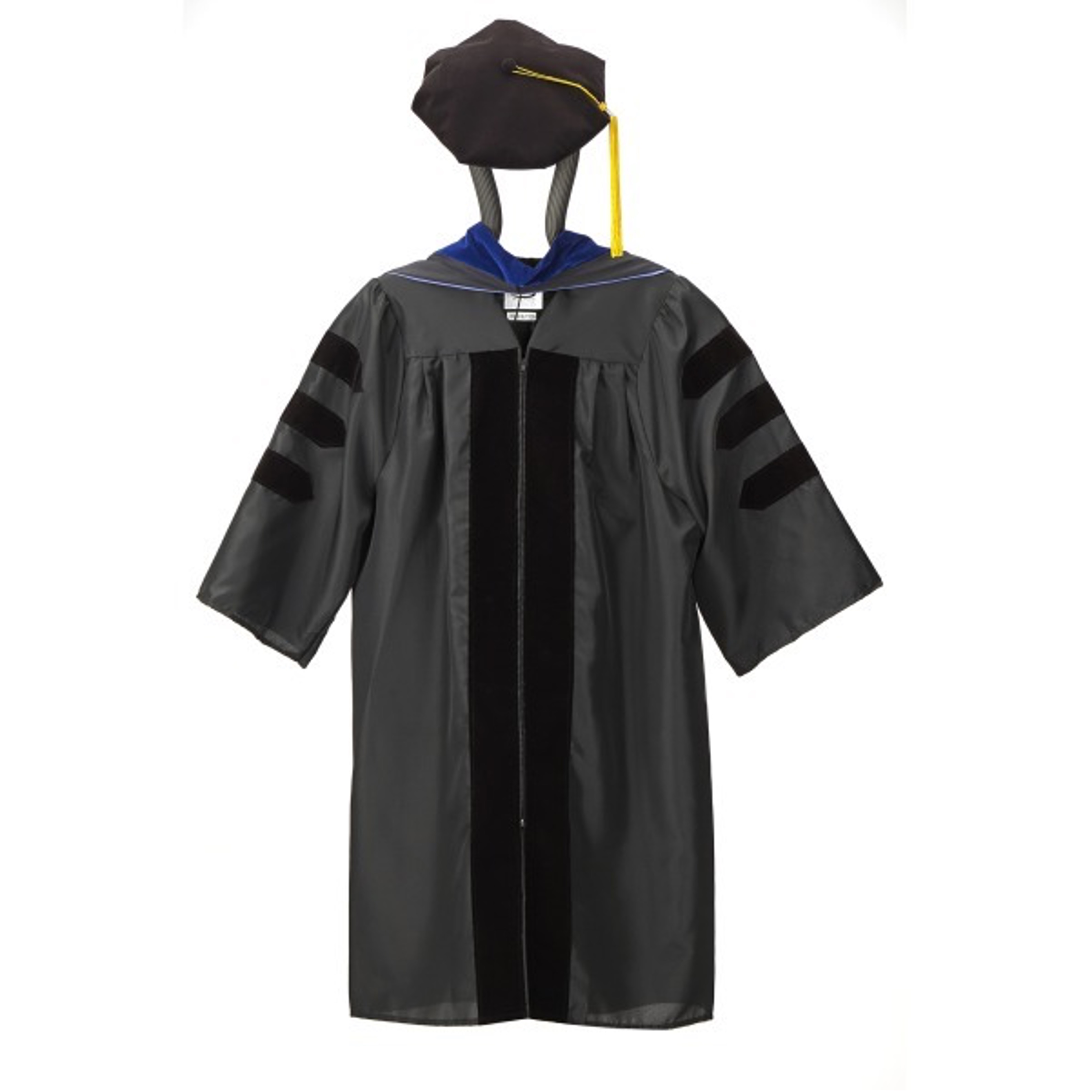 The COL regalia is black with purple velvet. Graduate wear a doctoral robe, hood and Tam with a purple UNTD COL tassel.