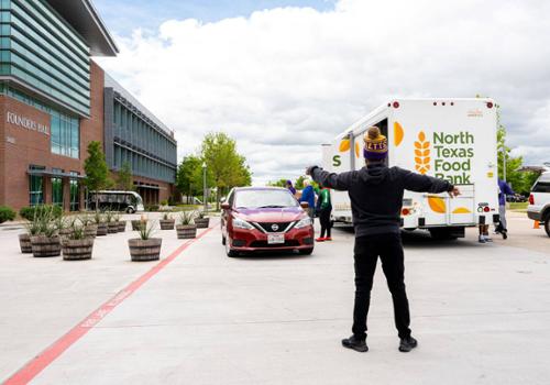 The University of North Texas at Dallas and the North Texas Food Bank joined together to hold a drive-thru food pantry on the UNT Dallas campus on Tuesday, March 31, to aid families in need during the COVID-19 crisis. Volunteers from UNT Dallas provided 3,750 boxes of food to approximately 1,200 households. A line of cars began to form well before the 9 a.m. start, and soon