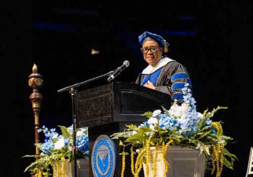 Full StoryDallas Mavericks President and CEO Cynthia "Cynt" Marshall shared dramatic, emotional pieces of her personal and professional lives with hundreds of UNT Dallas students and their families at the Spring Commencement ceremonies on May 14, 2024.