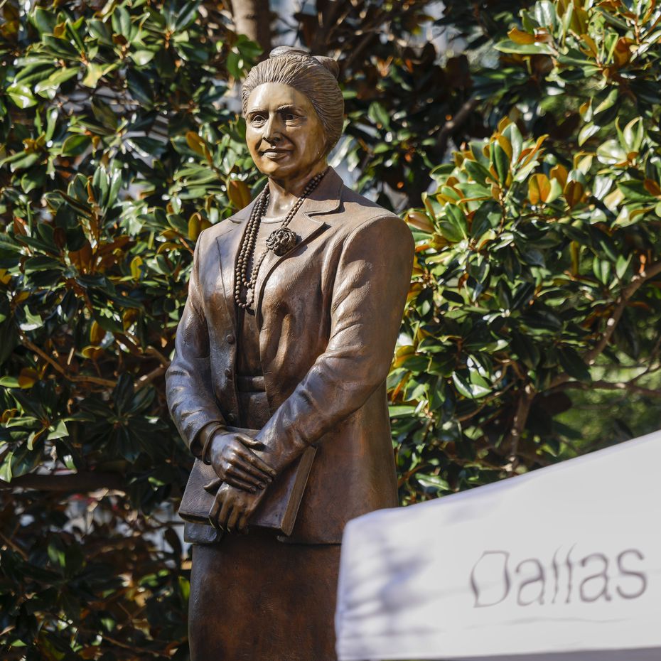 Main Street Garden Park is home to the $100,000 statue that faces toward the UNT Dallas College of Law. The artwork was completed over six years ago by Germán Michel, a Mexican artist and funded by private donations. The bronze statue captured Adelfa Callejo’s iconic presence with a determined smile, tailored business suit, her trademark boutonniere in the lapel, hair swept into a thick bun, and a lawbook in her hand.