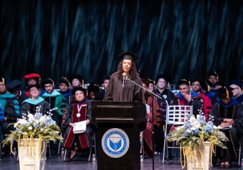 Undergraduate Stephany Sanchez and graduate student Daniel Weyandt spoke about the impact of their UNT Dallas journeys. “Let us remember the education we have received at UNT Dallas is not only for ourselves but for our society, so let us use our knowledge and experience to give back to our communities,” said Sanchez.