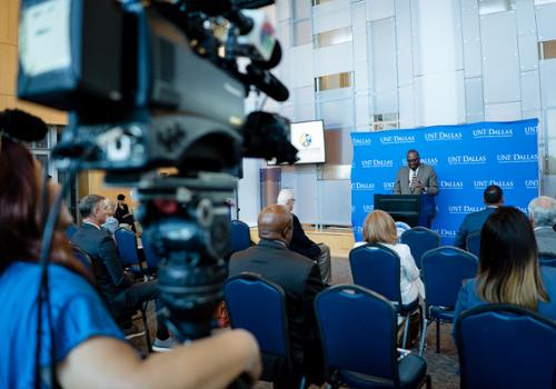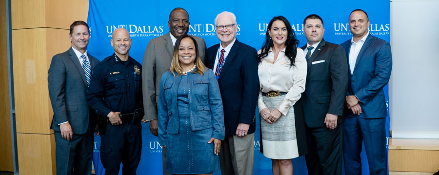 Dallas Police Chief Eddie Garcia, UNT Dallas Caruth Police Institute Vice Chair Zachary Flores, State Senator Royce West, TLEPN State Director Dustin Schellenger, and University of North Texas at Dallas President Bob Mong spoke at the event.