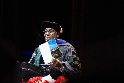 Sen. West challenged every graduate to become a “one person ambassador” for the university, noting it is the first and only public four-year university in the city of Dallas. “Look at that,” he said, holding up a photo of the beautiful, 240-acre campus in the Commencement program, “and think about where it will be in 20 years.”