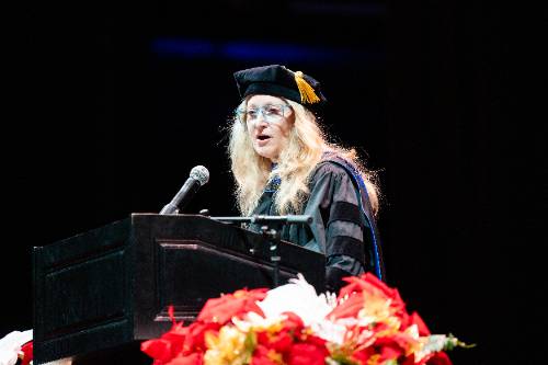 Keynote speaker Lynn McBee shared personal and professional experiences, both triumphs and tragedies, during an inspiring address to more than 400 UNT Dallas graduates at Commencement ceremonies on Dec. 17, 2024.