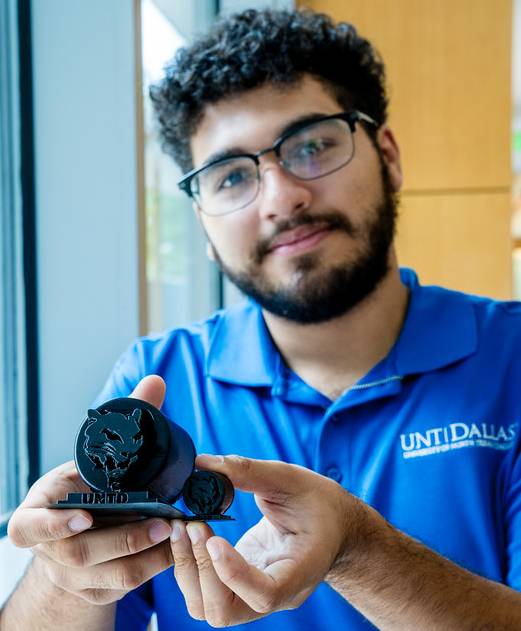Leslie Corro’s replication of the UNT Dallas mascot was time-consuming, in part because the 3D printer needed to make so many intricate cuts to produce the proper shape. The likeness, made into a pen or pencil holder, was very realistic and included the letters UNTD, so nobody could mistake who the Trailblazer logo represents.